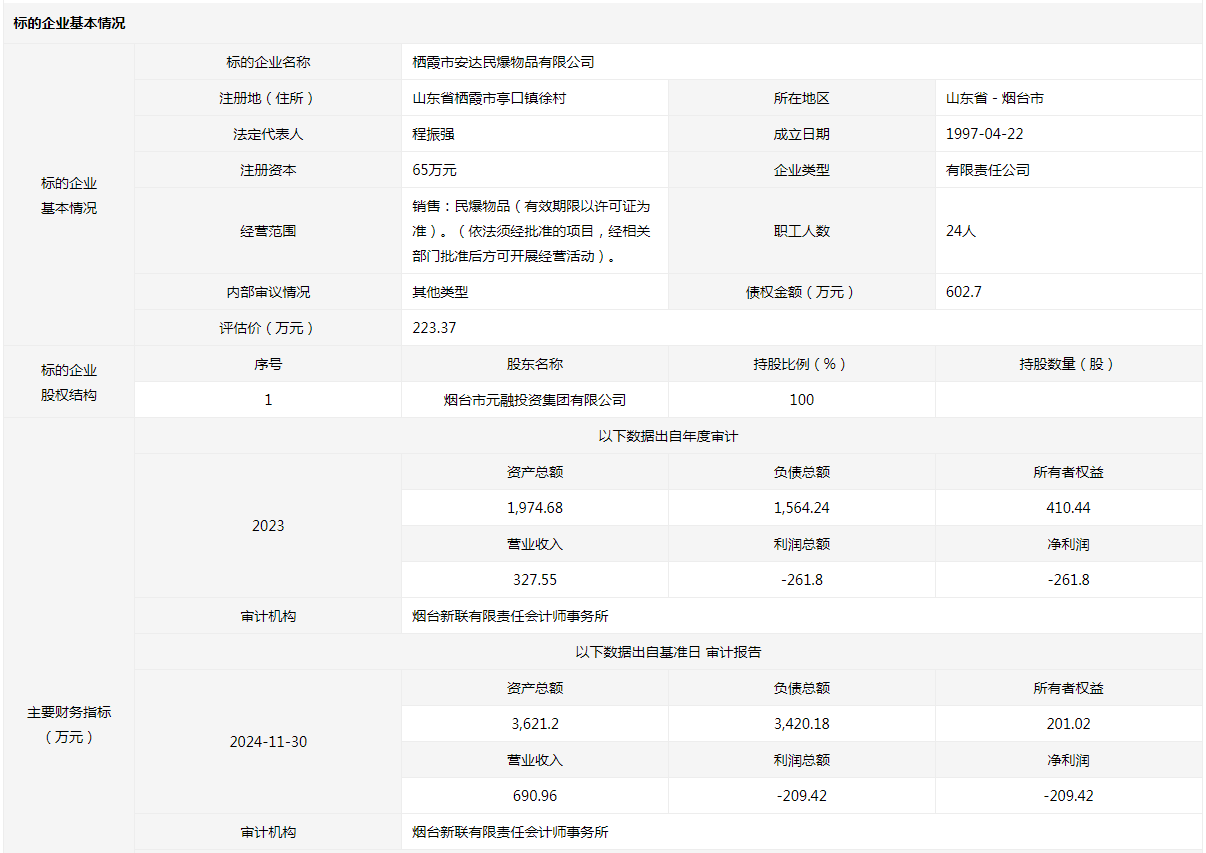 棲霞市安達(dá)民爆物品有限公司100%國(guó)有股權(quán)及債權(quán)