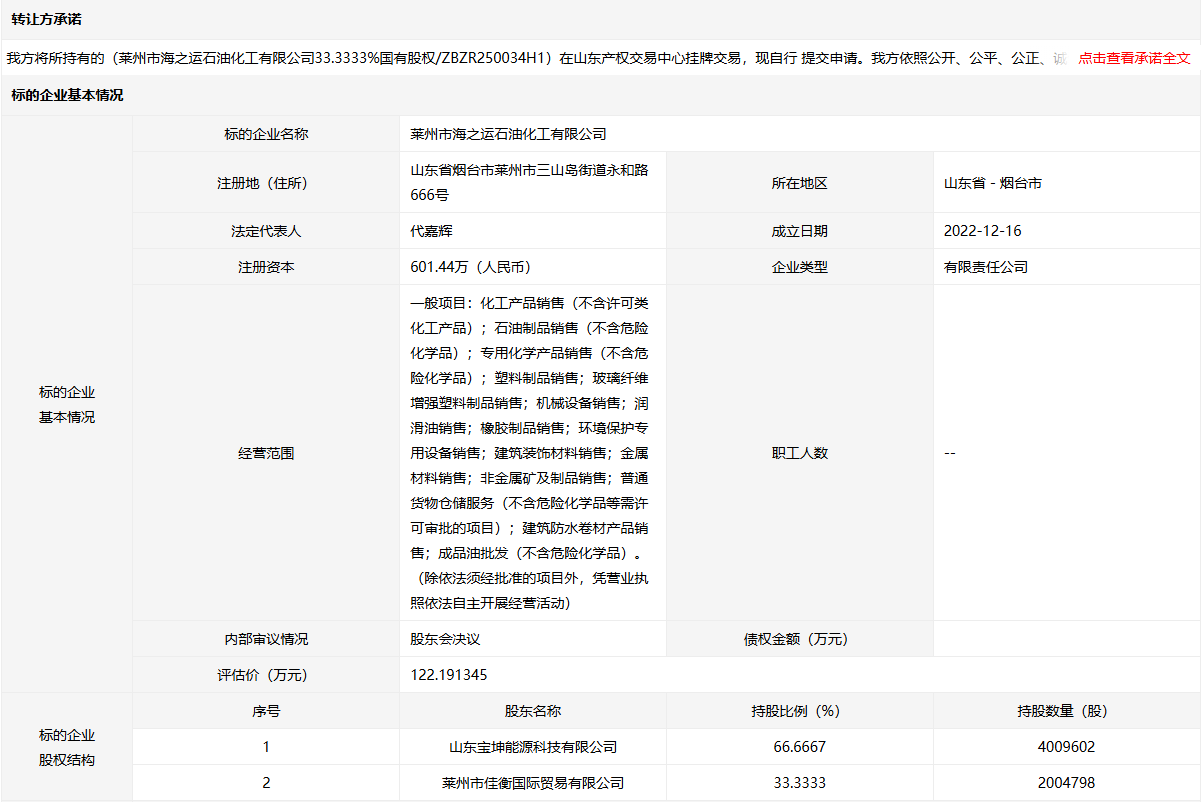 萊州市海之運石油化工有限公司33.3333%國有股權(quán)