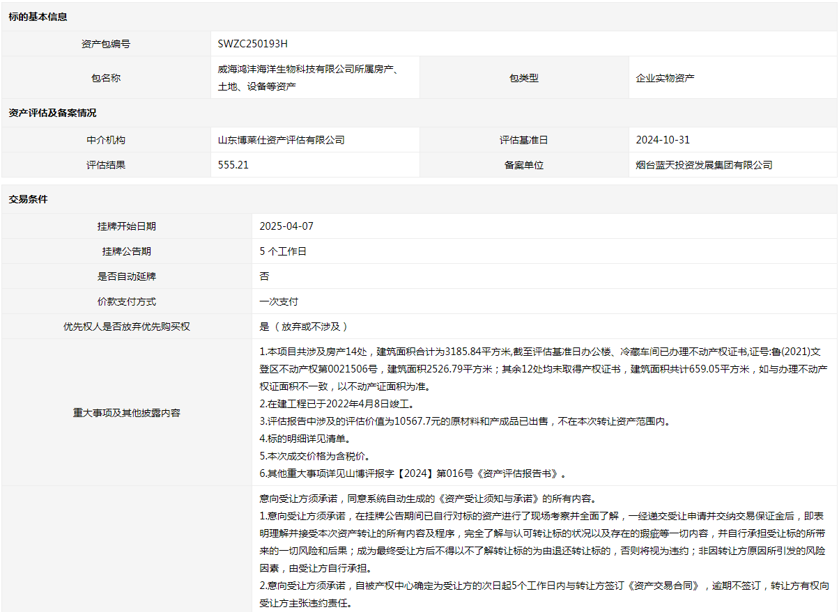 威海鴻灃海洋生物科技有限公司所屬房產(chǎn)、土地、設(shè)備等資產(chǎn)